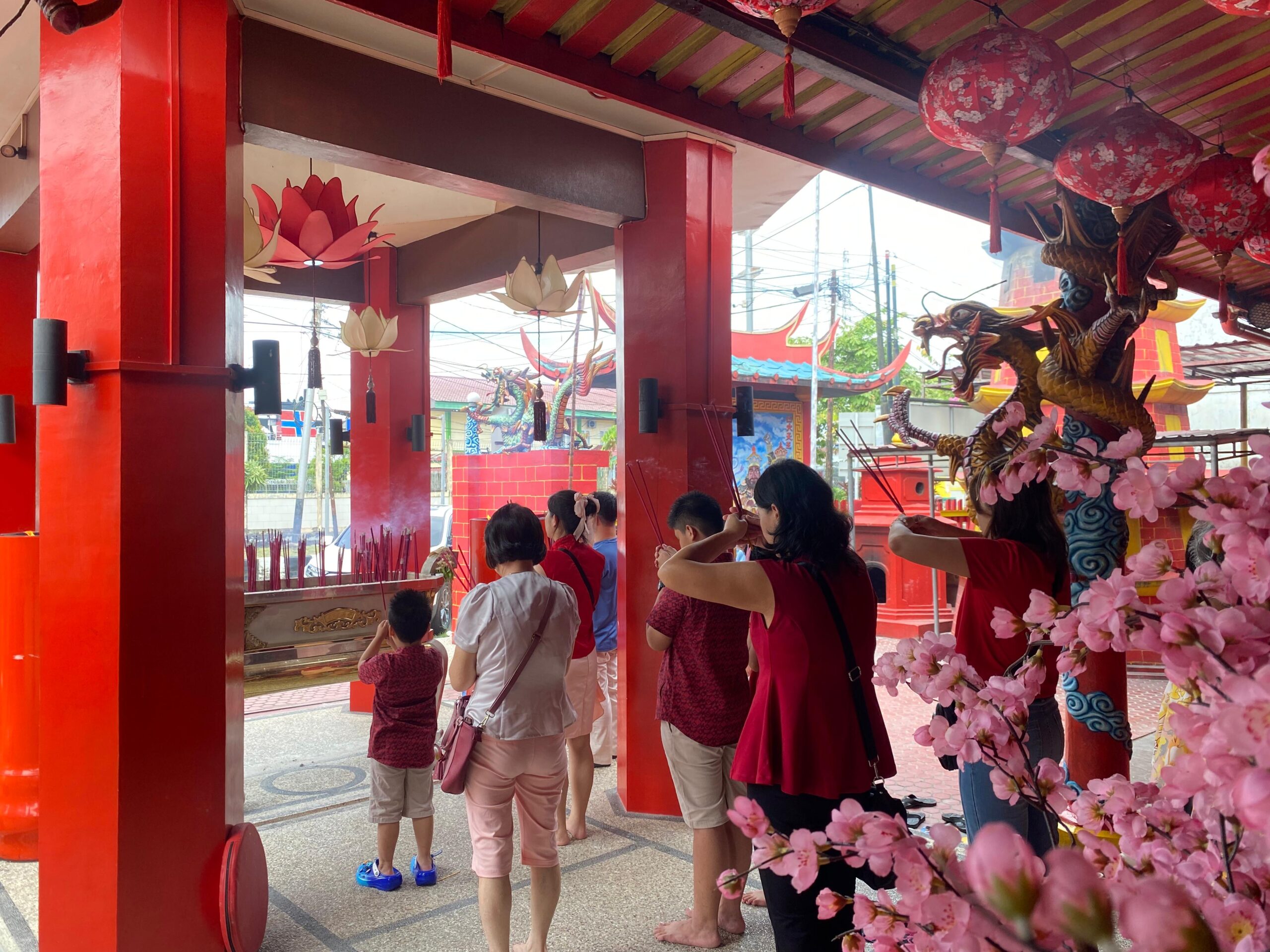 Di sisi kanan pelataran, lilin-lilin merah besar berdiri kokoh dengan nyala api yang stabil, perlahan melelehkan waktu dalam keheningan. Sementara di sisi kiri, beberapa umat menunduk khusyuk membakar kertas sembahyang atau kim cua, asapnya naik tipis ke udara sebagai simbol penghormatan kepada leluhur. Suasana terasa sakral namun hangat, seperti ruang yang memeluk setiap orang yang datang membawa harapan baru.